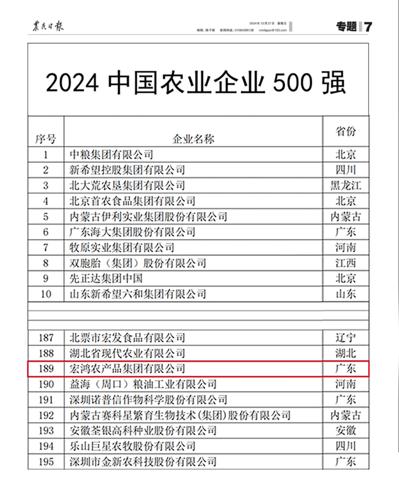 近日,農(nóng)民日報社經(jīng)過嚴格的信息匯集、審核以及專家評議等程序,正式發(fā)布了“2024年中國農(nóng)業(yè)企業(yè)500強”榜單。宏鴻集團以出色的業(yè)績表現(xiàn),再次脫穎而出,位列第189位,較去年上升67位,排名大幅提升。中國農(nóng)業(yè)企業(yè)500強榜單匯聚了糧油、畜牧、奶業(yè)、水產(chǎn)、食品等多個農(nóng)業(yè)相關領域的頭部企業(yè),是衡量農(nóng)業(yè)企業(yè)綜合實力的風向標,深受各界認可。自參選以來,宏鴻集團連續(xù)四年上榜,彰顯了其在食材配送行業(yè)的深厚底蘊和強勁實力。